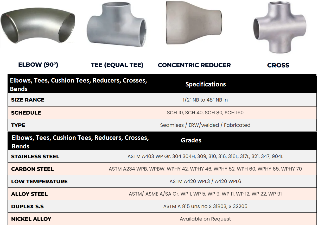 Elbows, Tees, Reducers, Caps, Stub Ends, Crosses, and Bends – robust, weldable fittings designed for high-pressure and high-temperature piping applications.