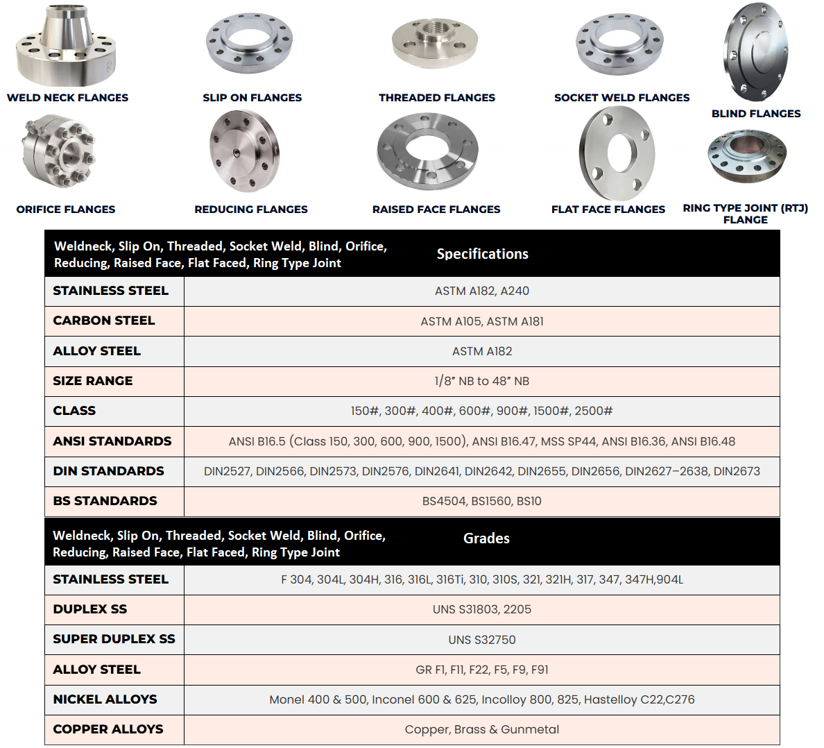 Weld Neck, Slip-On, Blind, Threaded, and Socket Weld flanges manufactured in accordance with industry standards and customer specifications.